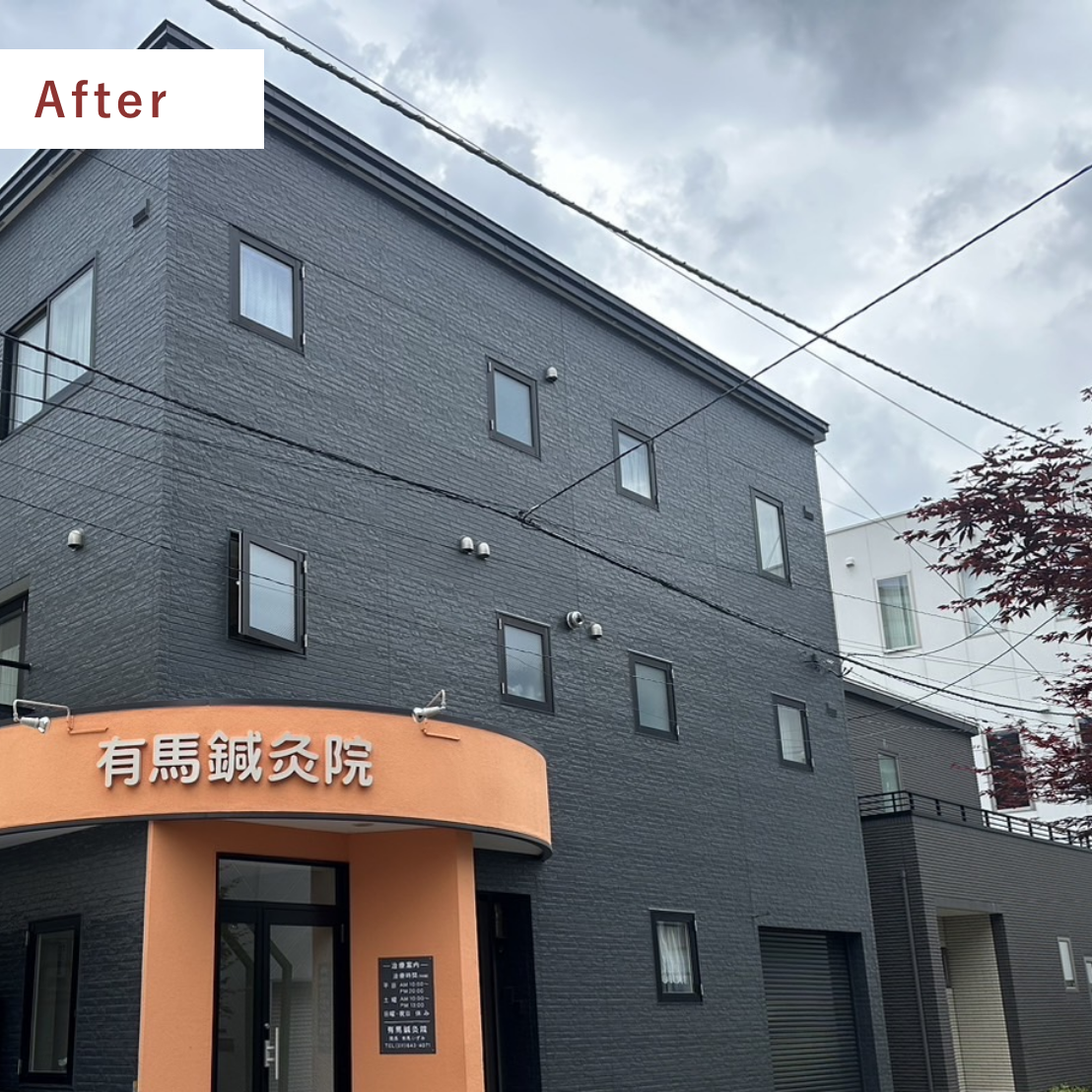 色については、お施主様のご希望に合わせて従来のブラウンからチャコールグレーに変更し、建物全体がぐっと引き締まった印象に仕上がっています。また、入口周りはアクセントカラーを活かして明るく仕上げ、来院される方に安心感と清潔感を与えるよう工夫しました。